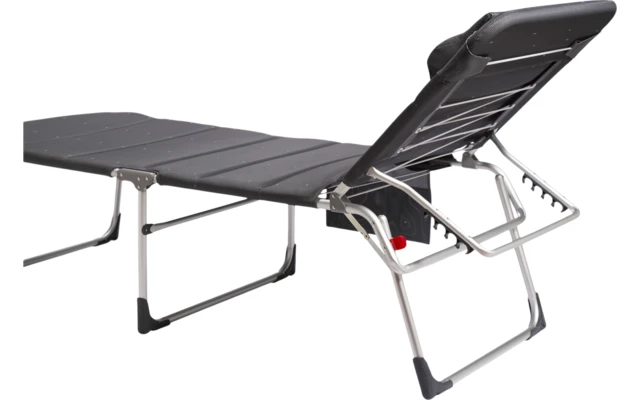 Eine sehr komfortable und extra hohe Liege. Die Liege ist vollständig gepolstert und kommt mit einem Kissen für maximale Entspannung. Durch die offene Gewebestruktur verbleibt keine Feuchtigkeit in diesem hochwertig gepolsterten Stoff. Die Rückenlehne dieser Liege ist 4-fach verstellbar. Sie bietet optimalen Komfort durch die elastische Befestigung des Stoffes. Für ein leichtes Platznehmen und Aufstehen ist die Liege extra breit, extra lang und extra hoch. Die robusten Stabilisatoren sorgen für optimalen Halt auf verschiedenen Untergründen. Inklusive praktischer Seitentasche für Strandaccessoires. Die Liege kann sehr flach zusammengeklappt werden, und ist mit den Tragegriffen leicht zu tragen.